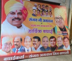 अगले नगर अध्यक्ष संजय अग्रवाल होंगे इस बात की सुगबुगाहट कई दिनों से चल रही थी लेकिन अब बधाई के होर्डिंग ने इस बात की पुष्टि भी कर दी है।