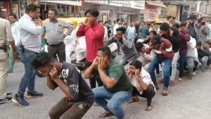 शहर में शुक्रवार को तीन थानों की पुलिस ने चाकूबाजी की वारदात में शामिल 14 बदमाशों का जुलूस निकाला था। आगे तीन लोग ढोल बजाते हुच चल रहे थे। पीछे-पीछे आरोपी को कान पकड़वाकर चलवाया गया था। कोतवाली थाना पुलिस ने कुशलपुरा निवासी विकास करपरिया समेत 6 रिकॉर्डधारी को थाने बुलाकर इस जुलूस का हिस्सा बनाया।