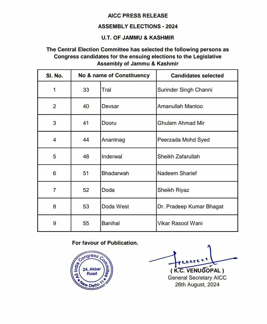 जम्मू-कश्मीर विधानसभा चुनाव में कांग्रेस और नेशनल कांफ्रेंस साथ मिलकर चुनाव लड़ रही हैं। कांग्रेस ने सोमवार देर रात 9 कैंडिडेट की पहली लिस्ट जारी कर दी। वहीं नेशनल कॉन्फ्रेंस ने भी 19 उम्मीदवारों का ऐलान कर दिया है।