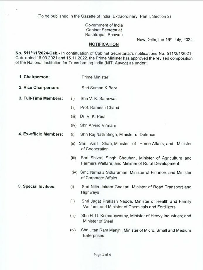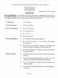 राष्ट्रपति भवन ने नीति आयोग में नए सशोधन को अपनी सहमति दे दी है। इस बाबत एक अधिसूचना भी जारी की गई है। इसमें कहा गया है कि कैबिनेट सचिवालय की अधिसूचना के क्रम में प्रधानमंत्री ने नीति आयोग की संशोधित संरचना को मंजूरी दे दी है।