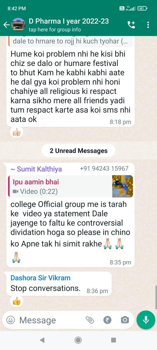 सोशल मीडिया पर ग्रुप के जो स्क्रीन शोर्ट चल रहे है वह पोस्ट एक साल पुरानी है , वह उनके द्वारा नहीं डाली गई वही एक छात्र के द्वारा ही डाली गई वह भी रमजान मुबारक बाद की थी | ग्रुप में पोस्ट को लेकर जो बहस हुई वह भी स्टूडेंट ही कर रहे थे उन्हें चुप रहने के लिए भी विभाग प्रभारी द्वारा कहा गया था उसमे मेरी कोई पोस्ट नहीं है |