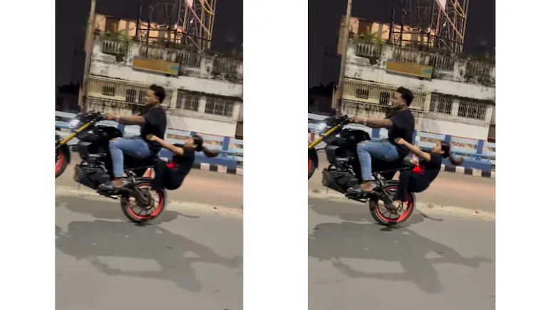 कोलकाता (Kolkata) के एक बाइकर के लापरवाह स्टंट का एक वीडियो (Stunt Video), जिसमें पीछे बैठी एक महिला की जान जा सकती थी, सोशल मीडिया पर वायरल हो रहा है. सायन अचार्जी द्वारा इंस्टाग्राम पर साझा किए गए वीडियो में बाइकर को खतरनाक व्हीली यानी बाइक के अगले हिस्से को जमीन से ऊपर उठाकर चलाने का प्रयास करते हुए दिखाया गया है. हालांकि, स्टंट तब बुरी तरह गलत हो गया जब उसके पीछे बैठी महिला ने अपना संतुलन खो दिया. जैसे ही बाइक की गति तेज हुई, महिला उछलकर बाइक की सीट और पहिए के बीच फंस गई.