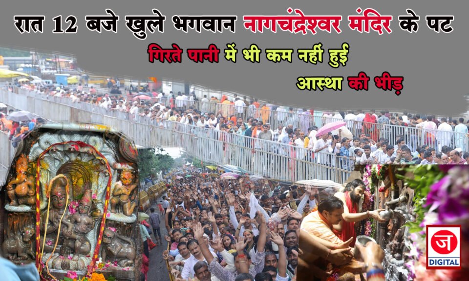 महाकाल मंदिर के शीर्ष पर स्थित नागचंद्रेश्वर मंदिर के पट खुले , गिरते पानी में भी कम नही हुई लोगो की आस्था