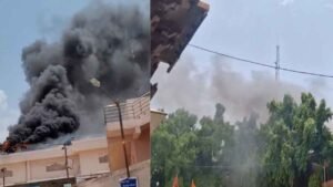 महाकाल मंदिर परिसर में अचानक आग:पॉल्यूशन कंट्रोल बोर्ड के एयर क्वालिटी मैनेजमेंट सिस्टम की बैटरियां में लगी आग