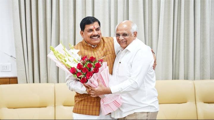 मुख्यमंत्री डॉ. मोहन यादव ने भोपाल स्टेट हैंगर पर गुजरात के मुख्यमंत्री श्री भूपेंद्र पटेल का पुष्प-गुच्छ भेंट कर स्वागत किया।