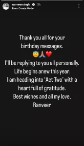 इंस्टाग्राम फैमिली के लिए स्टोरी पर लिखा, “आप सभी को जन्मदिन के संदेशों के लिए धन्यवाद. मैं आप सभी को व्यक्तिगत रूप से जवाब दूंगा. इस साल जीवन की नई शुरुआत हुई है. मैं कृतज्ञता से भरे दिल के साथ ‘एक्ट टू’ की ओर बढ़ रहा हू. शुभकामनाएं और मेरा ढेर सारा प्यार, रणवीर.”