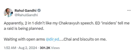 उन्होंने लिखा- टू-इन-1 को संसद में मेरा चक्रव्यूह भाषण पसंद नहीं आया। ED के अंदरूनी सूत्रों ने मुझे बताया कि मेरे खिलाफ रेड की योजना बनाई जा रही है। मैं ED अधिकारियों का बांहें फैलाकर इंतजार कर रहा हूं। चाय और बिस्किट मेरी तरफ से।