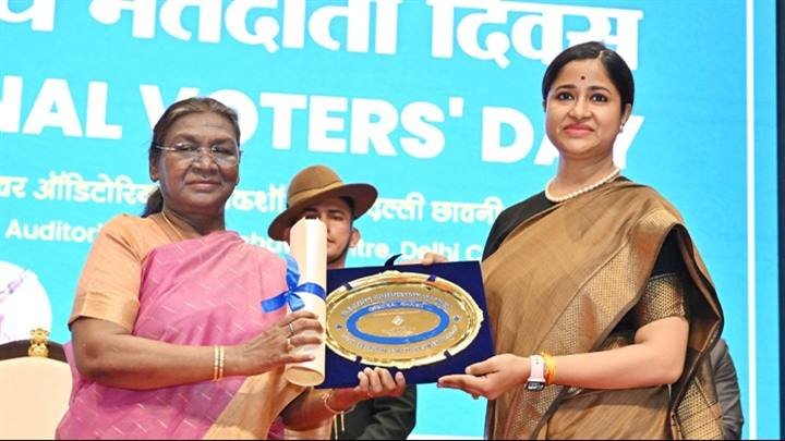 राष्ट्रपति श्रीमती मुर्मु ने स्वीप गतिविधियों के लिये झाबुआ कलेक्टर सुश्री नेहा मीणा को किया सम्मानित