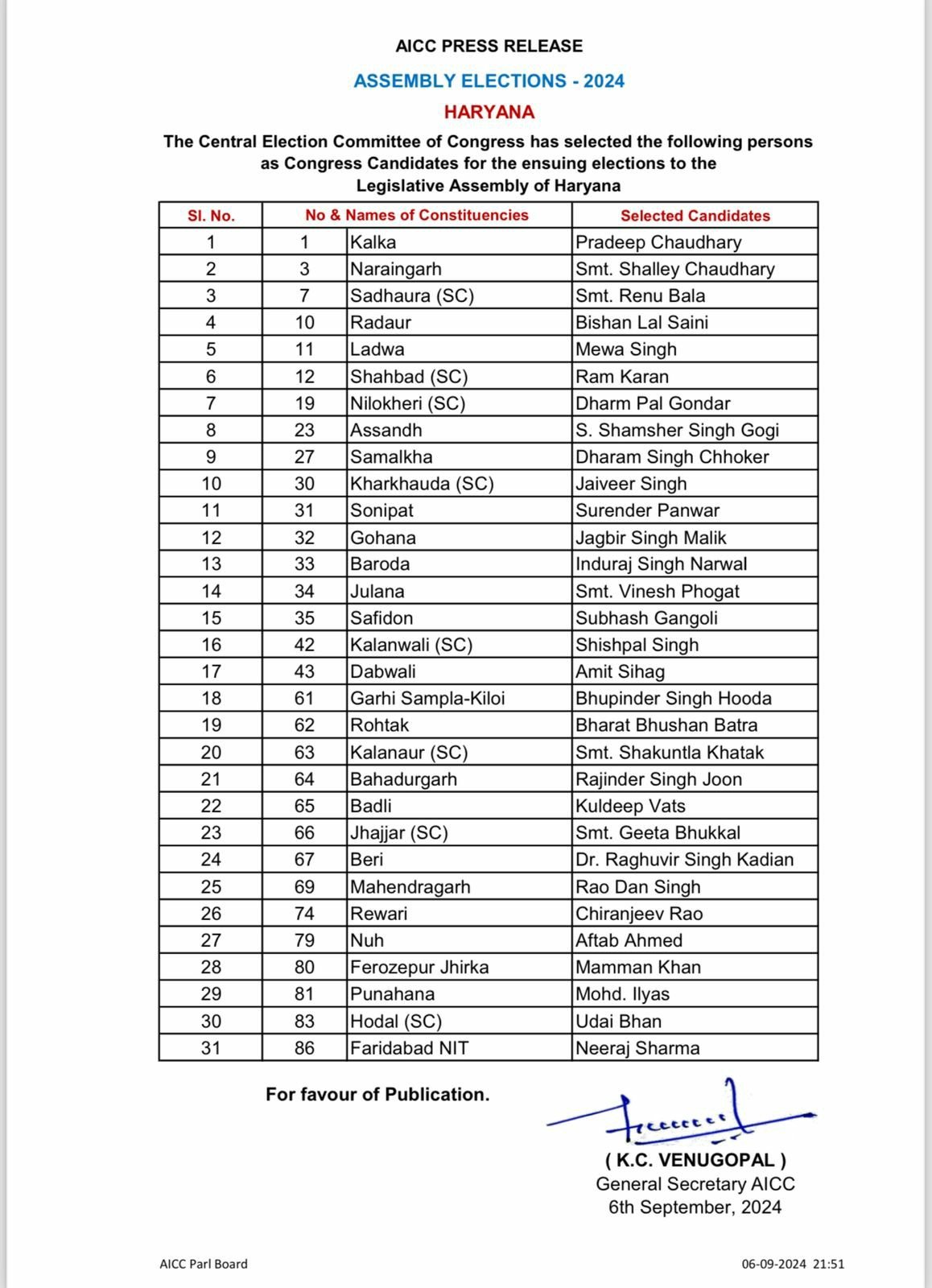हरियाणा विधानसभा चुनाव के लिए कांग्रेस ने 6 सितंबर की देर रात दो लिस्ट में 32 उम्मीदवारों का ऐलान किया। पहली लिस्ट में 31 उम्मीदवारों का ऐलान किया गया। डेढ़ घंटे बाद दूसरी लिस्ट में एक कैंडिडेट का नाम घोषित किया।
