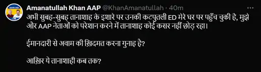 ED के एक्शन के बाद अमानतुल्लाह ने कहा- सर्च वारंट के नाम पर ED का मकसद सिर्फ मुझे गिरफ्तार करना है। मैंने हर नोटिस का जवाब दिया है। मुझे 2 साल ये लोग मुझे परेशान कर रहे हैं।