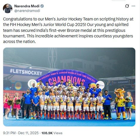 Congratulations to our Men’s Junior Hockey Team on scripting history at the FIH Hockey Men’s Junior World Cup 2025! Our young and spirited team has secured India’s first-ever Bronze medal at this prestigious tournament. This incredible achievement inspires countless youngsters… pic.twitter.com/iEbPd2Jh1z